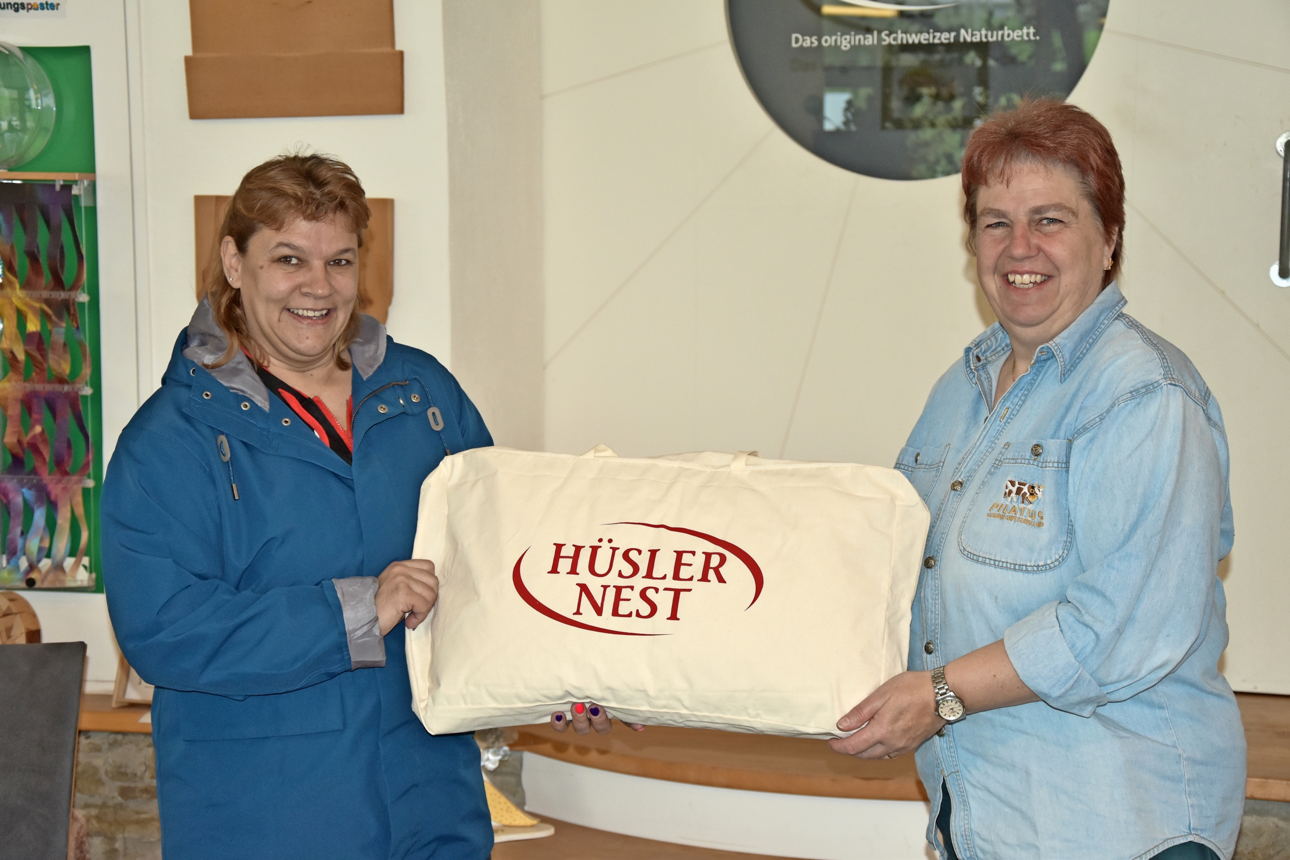 Gewinnerin des Wettbewerbs der Campingausstellung Herbst 2022: Katja Karrer aus Rheinfelden (l.) erhält das Arvenwoll-Kissen von Anita Giger.