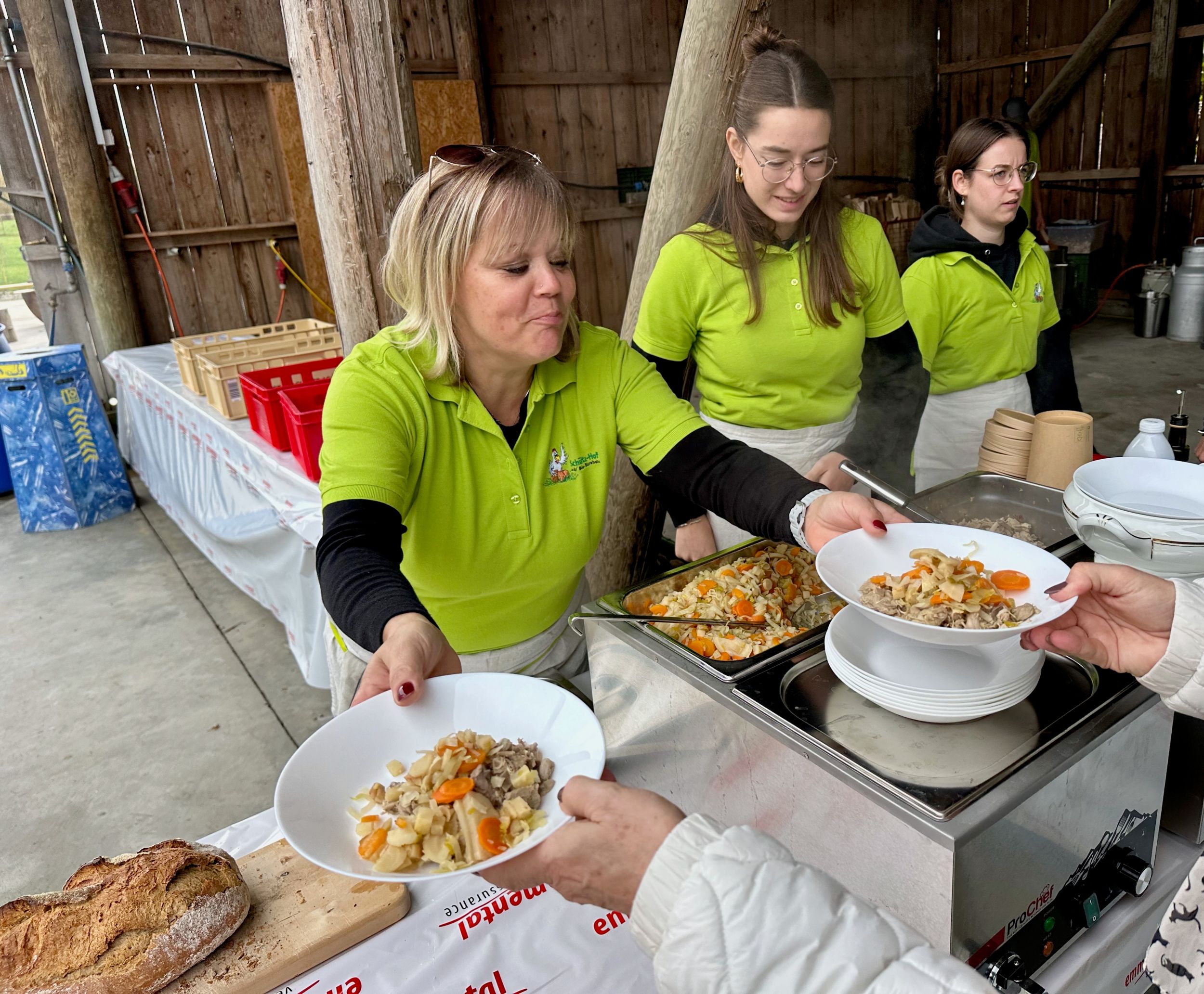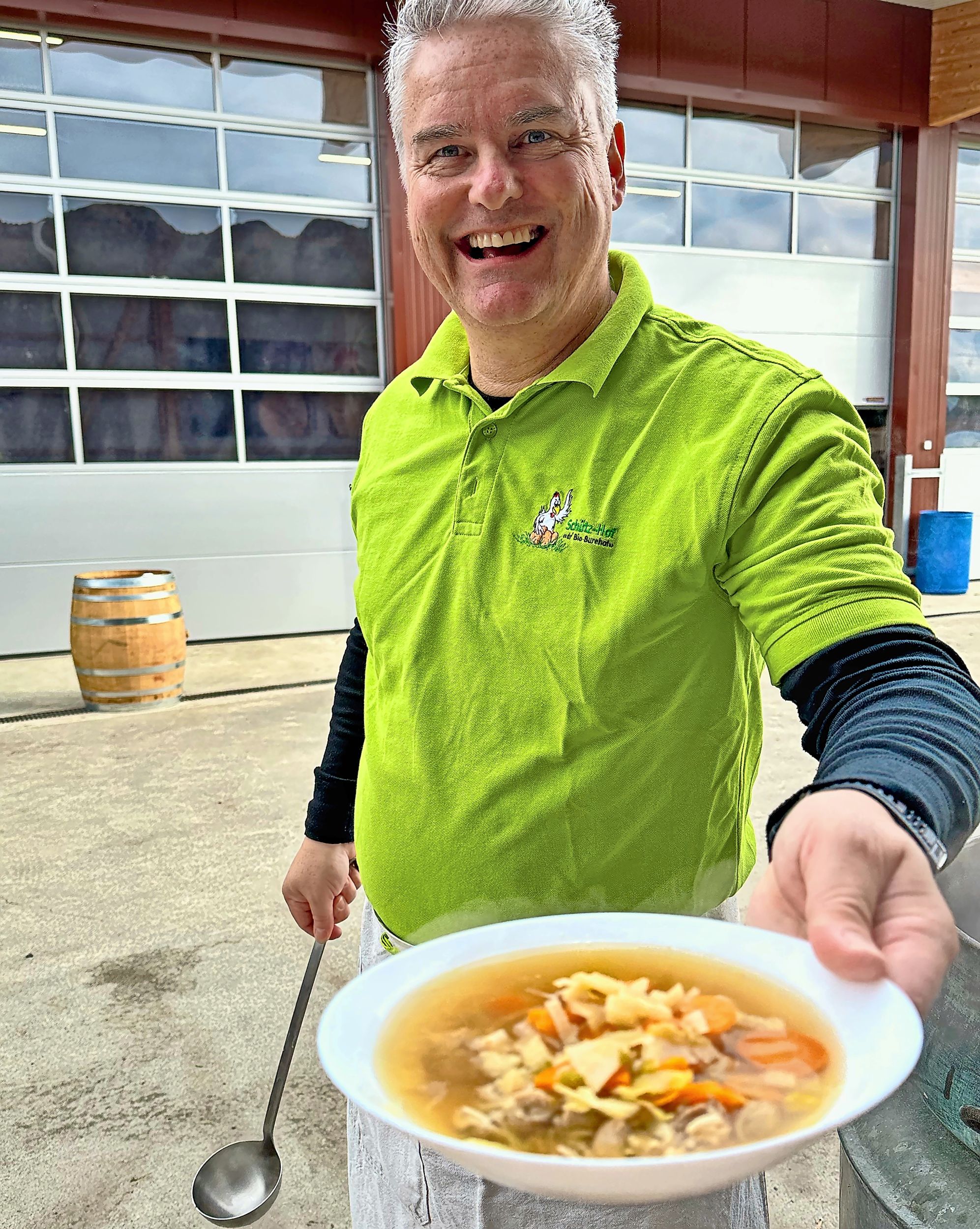 Beim Hühnersuppenfest auf dem Schütz-Hof in Strengelbach werden Legehennen, die keine Eier mehr legen, als Delikatesse serviert. Ob es den altgedienten Hühnern vom Schütz-Hof an Halloween an den Kragen ging, wollte Barbara Schütz, die den Bio-Hof an der Aeschwuhrstrasse zusammen mit ihrem Mann Markus betreibt, so nicht bestätigen. Fakt ist, dass tags darauf am Hühnersuppenfest 60 der rund 4000 Legehennen, die auf dem Schütz-Hof leben, Federn lassen mussten. Für die Suppe wurden 200 Liter Bouillon aufgebrüht, dazu rund 50 kg Gemüse gerüstet, konkret Sellerie, Zwiebeln, Rüebli, Petersilienwurzeln, Lauch und Kabis.