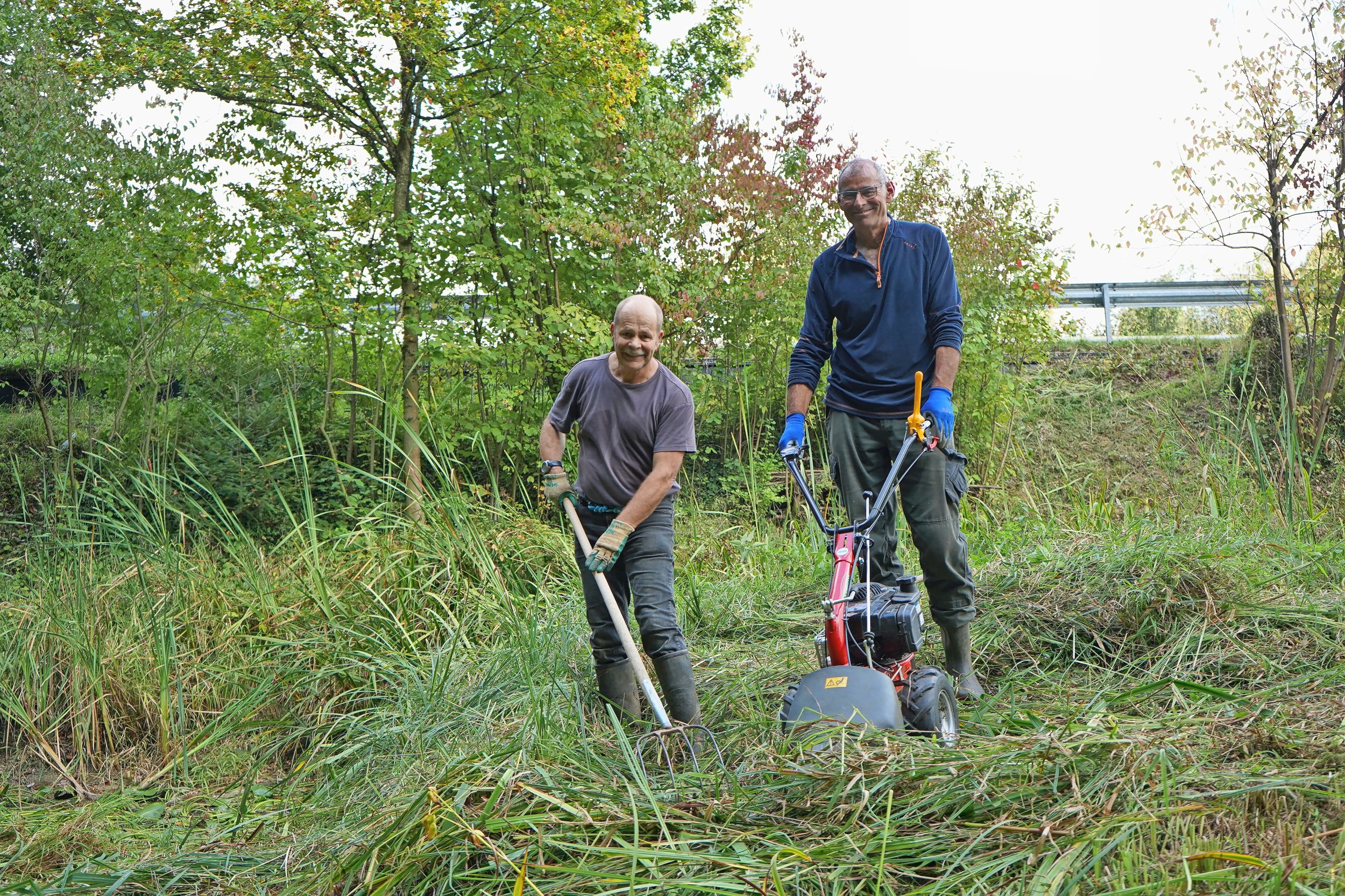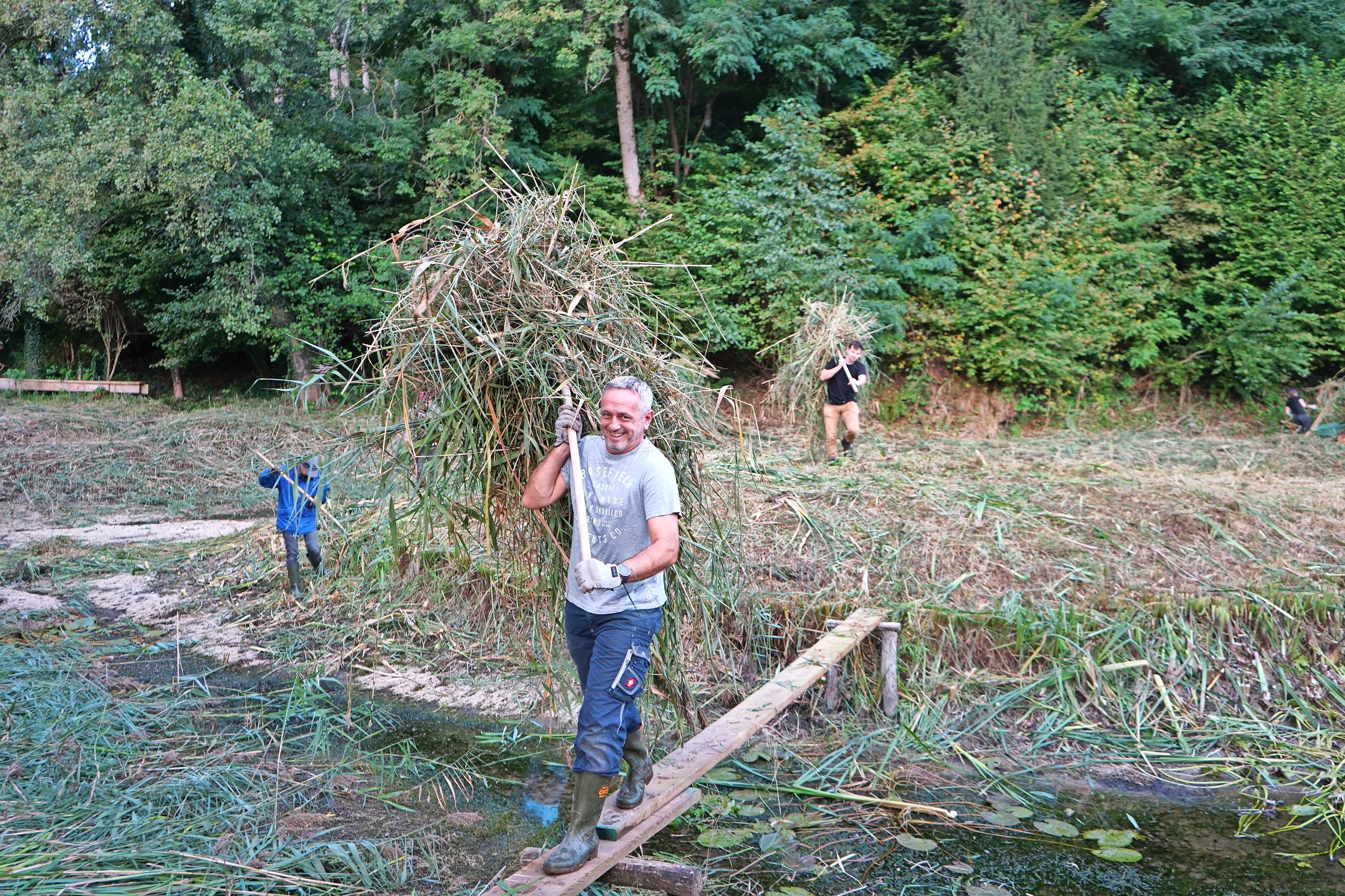 Im Vorfeld hatten die zwei Mäh-Experten im Verein mit Balkenmäher und Sense bereits das gesamte Schilf geschnitten. Trotzdem gab es noch Arbeit genug zu erledigen, um dieses wichtige Amphibienlaichgebiet vor dem Verlanden zu schützen. Es galt, das Schnittgut herauszutragen, den Weiher-Zulauf von Schlick und Sand zu befreien, Randsteine zu reinigen, Zweige zurückzuschneiden und Gestrüpp auszulichten.