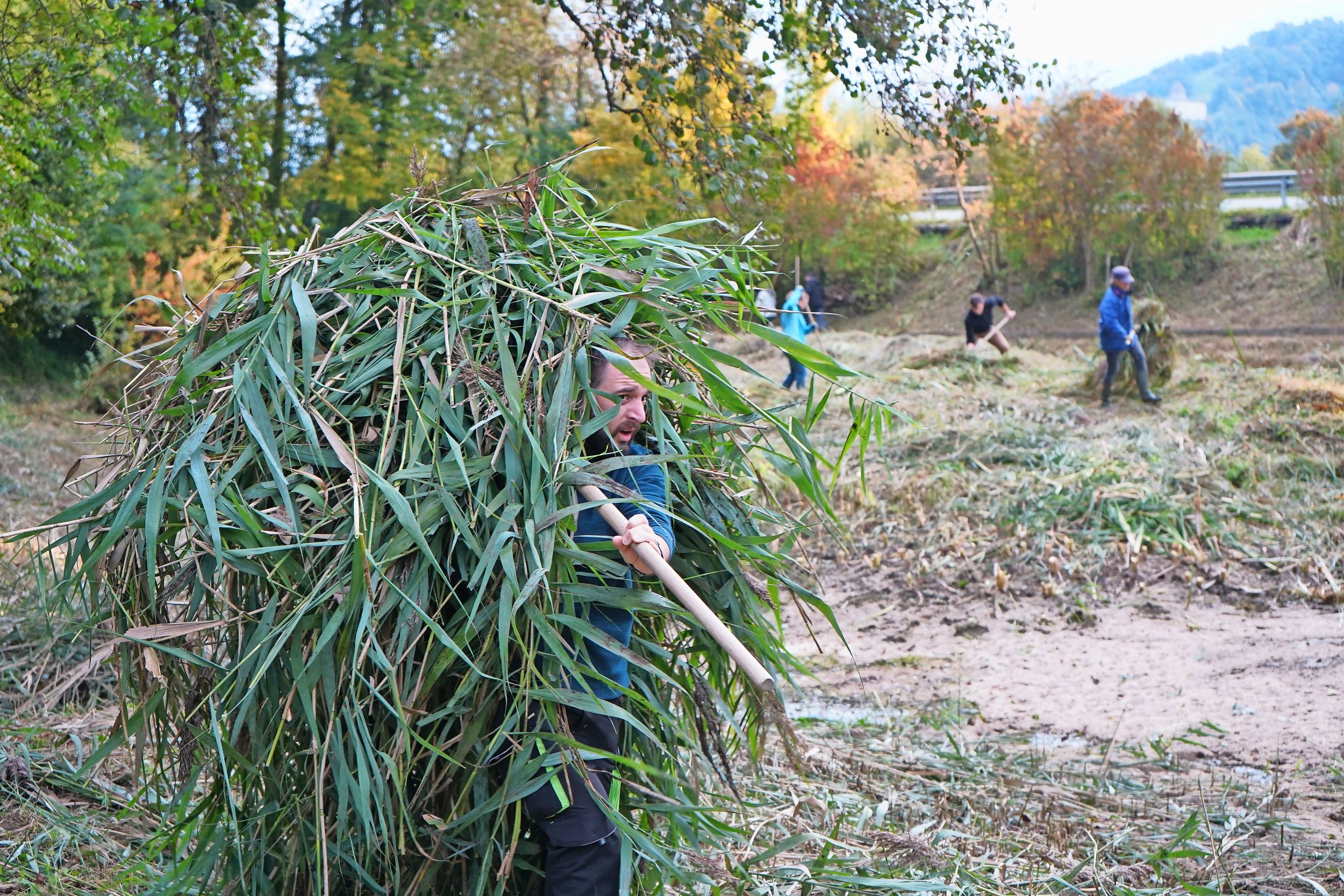 Voller Elan machte sich die Helfertruppe an die Arbeit. Die einen trugen auf ihren Heugabeln derart mächtige Schilfhaufen aus dem Weiher, dass man sie darunter kaum noch erkennen konnte. Die anderen balancierten gekonnt über den schmalen Steg zum Inselchen. Und wieder andere liessen sich nicht einmal von durchnässten Schuhen aus der Ruhe bringen. Bereits beim wohlverdienten, feinen Znüni lag ein Grossteil des Schilfes zum Abtransport bereit. Ein kurzer Effort noch – und der Haldengutweiher war so sauber wie schon lange nicht mehr.