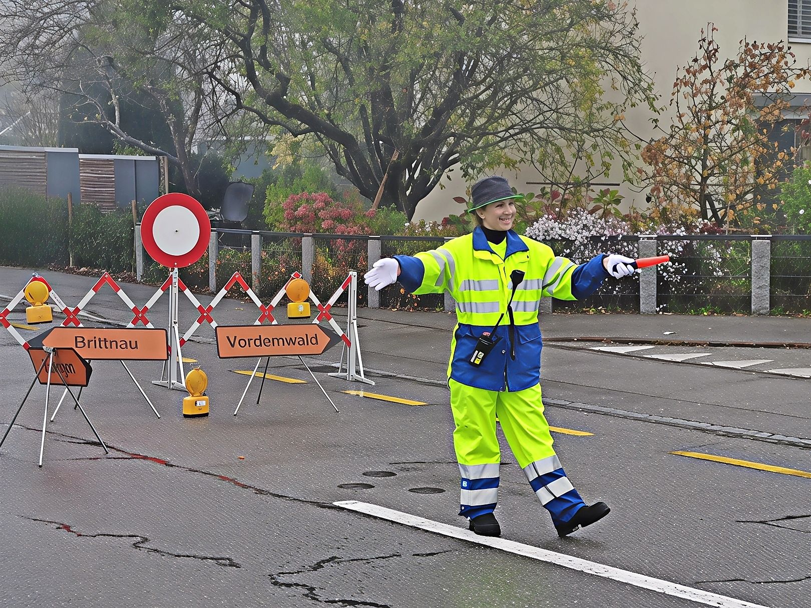 Korrekte Umleitung und Verkehrsregelung mit einem lachenden Gesicht.