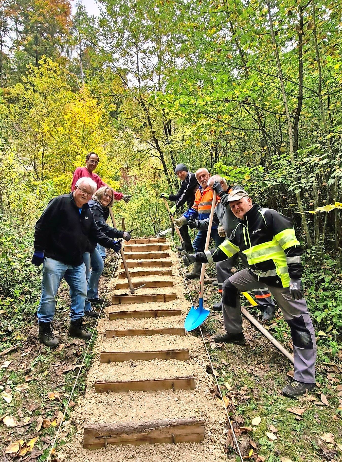 Am 13. Oktober trafen sich 9 Macher vom Natur- und Vogelschutzverein Oftringen NVO in der Bachthalen, um die marode Treppe zum Bachthalen-Weiher zu sanieren. Roger Grivel vom Bauamt Oftringen deponierte vorgängig eine Mulde mit Jurastein-Mergel.