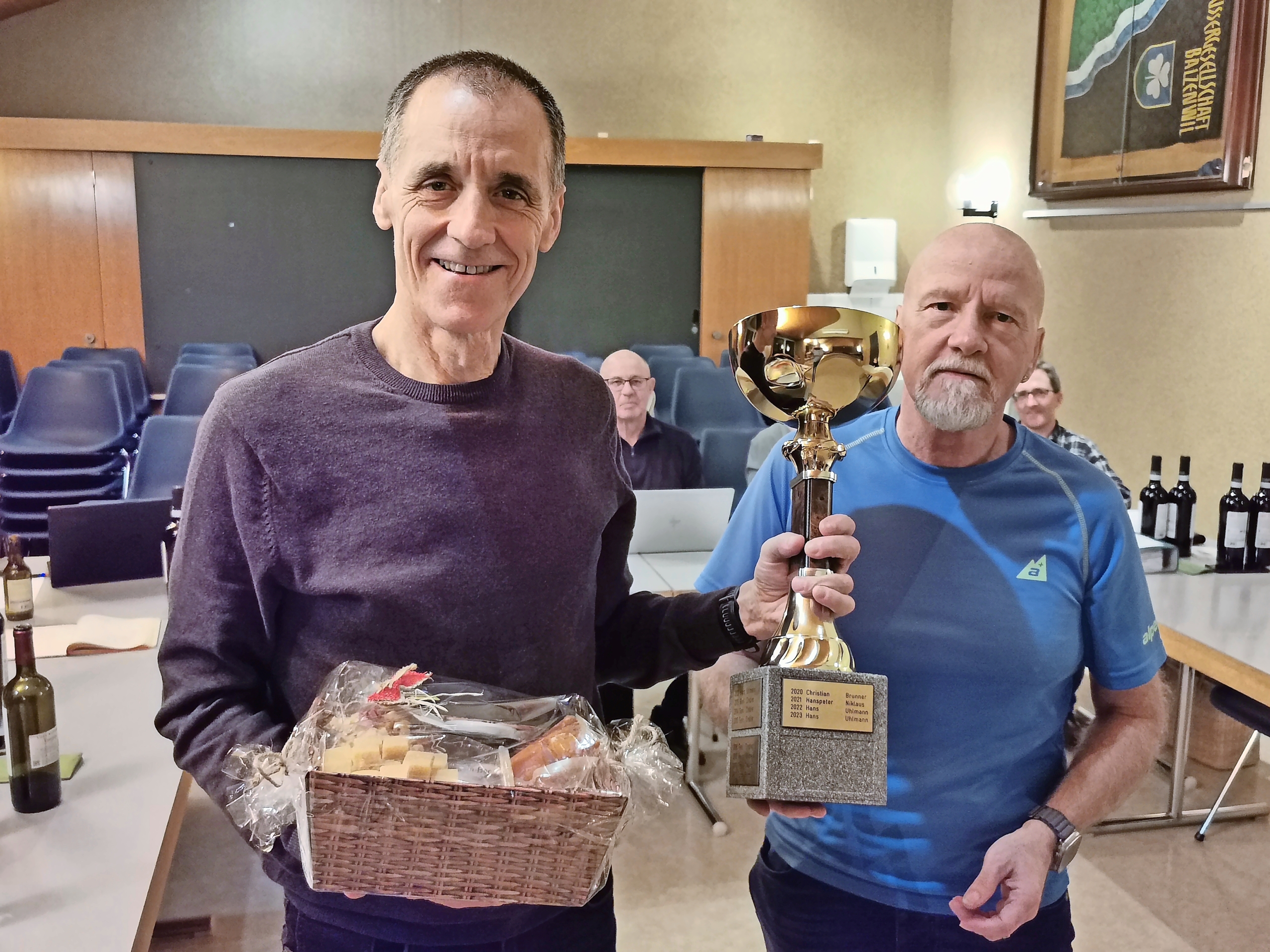 Fahrwart Martin Steuri (rechts) übergibt Vereinsmeister Hans Uhlmann den Wanderpokal.